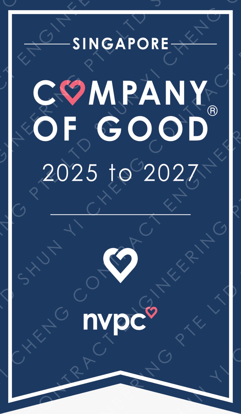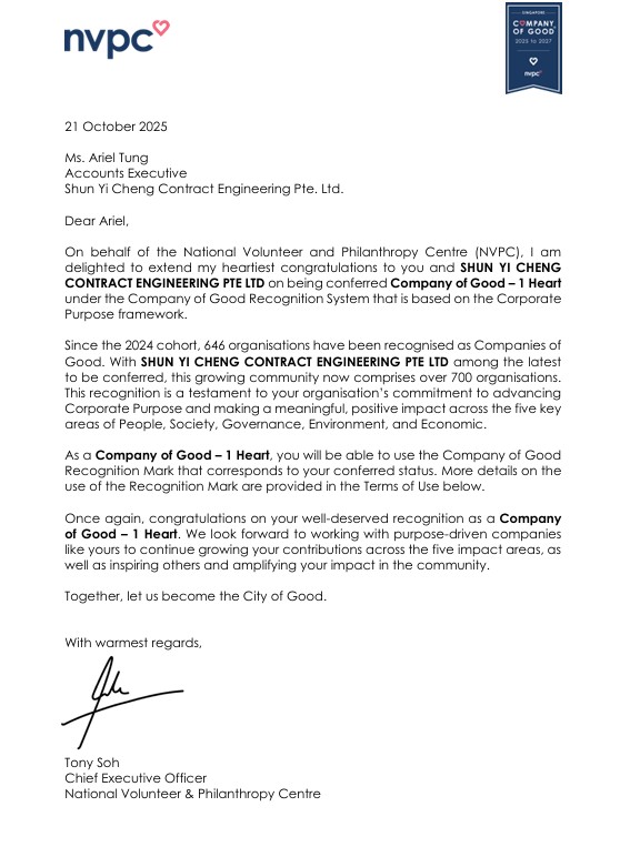 Dear Ariel, On behalf of the National Volunteer and Philanthropy Centre (NVPC), I am delighted to extend my heartiest congratulations to you and SHUN YI CHENG CONTRACT ENGINEERING PTE LTD on being conferred Company of Good – 1 Heart under the Company of Good Recognition System that is based on the Corporate Purpose framework.